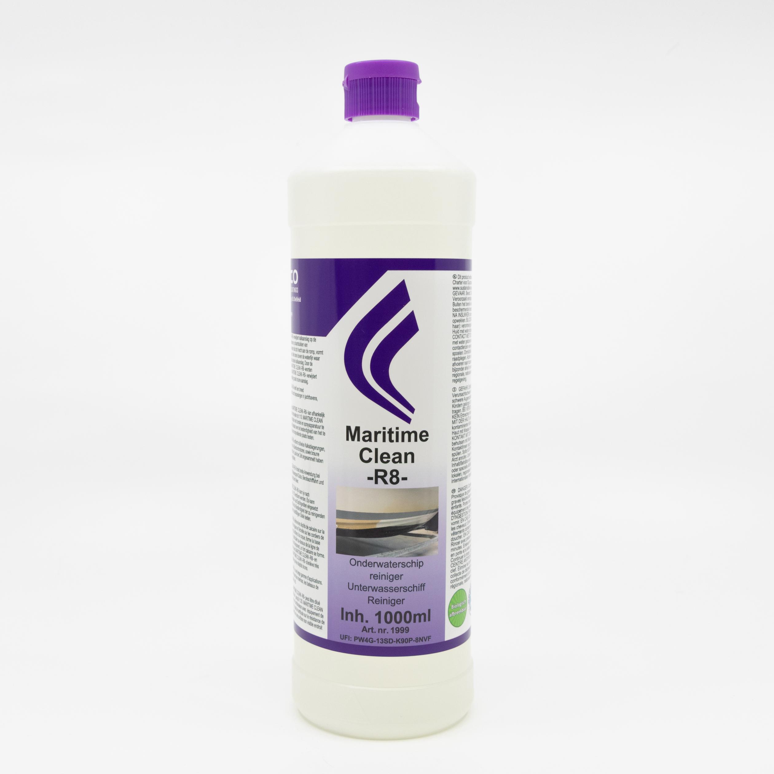 Met MARITIME CLEAN -R8- kunt u gemakkelijk kalkaanslag van boten verwijderen. Ook verwijdert MARITIME CLEAN algen aangroei en ketelsteen op staartstukken van buitenboordmotoren. Kalk uit het water dat zich hecht aan de romp, vormt de ideale voedingsbasis voor algen. Met name boven de waterlijn waar opspattend water verdampt ontstaat sterke kalkaanslag. Door de kalkaanslag te verwijderen met MARITIME CLEAN -R8- worden tegelijkertijd de algen verwijderd. MARITIME CLEAN -R8- verwijdert zeer gemakkelijk onderwatervervuiling zoals bruine aanslag.